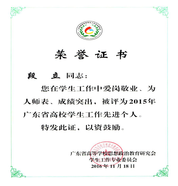 校团委副书记段立荣获“2015年广东省高校学生工作先进个人”。