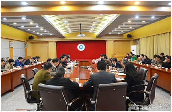我校校长黄大乾(左,下起第三个)在座谈会上致辞