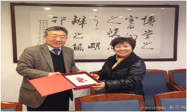 广东省教育研究院院长汤贞敏(右)授予我校党委副书记李纯英(左)民办教育研究基地牌匾