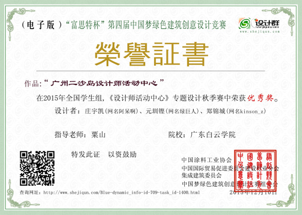 3月28 日,从“中国梦绿色建筑设计大赛”组委会传来捷报,我校建筑工程学院2012级建筑学2班庄宇凯等同学设计的作品《广州二沙岛设计师活动中心》从三百七十多份参赛作品中脱颖而出,荣获第四届“中国梦绿色建设设计大赛”优秀奖。