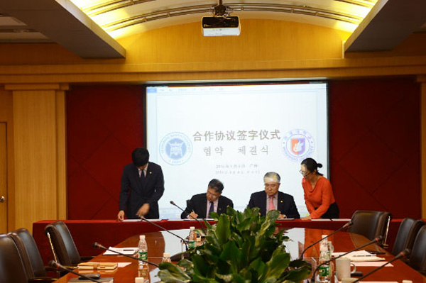 我校副校长沈根生(左二)和韩国圆光大学校长金道宗(右二)签订合作协议