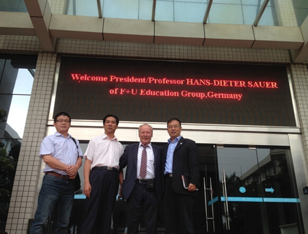 11月23日下午,欧洲著名应用外国语大学“德国慕尼黑应用语言大学”校务委员会主席、副校长Andrew Williams 教授及该校中国事务主任李冰一行来访我校。我校副校长沈根生和中德国际项目主任麦毅鸿接待了来宾。双方总结了两校签署合作协议一年以来合作项目发展情况并同意:(1)两校继续积极推动中德翻译专业的“2+2.5”和“2+3”双学位项目的合作;(2)在我校3+1人才培养模式上双方努力为我校德语大四学生开发一年期的境外实习/游学项目;(3)在学生交流的基础上,双方推动教师交流和教学资源共享。晚上,外国语学院德语系全体师生为来宾组织了“德语国家文化展演”。