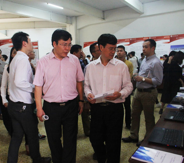 董事长谢可滔(左一)陪同来宾参观我校学生创新创意作品展