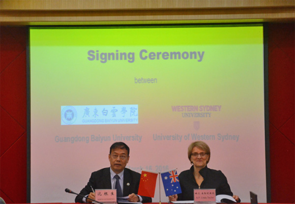 我校副校长沈根生(左)与西悉尼大学副校长琳达·泰勒(右)签署合作备忘录