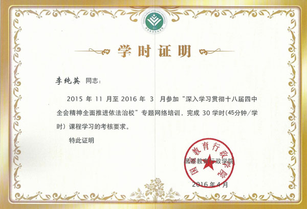 我校党委副书记李纯英教授的“深入学习贯彻十八届四中全会精神全面推进依法治校“专题网络培训结业证书”