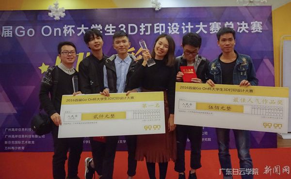 12月30日,由广州高岸信息科技有限公司举办的首届“Go On杯”大学生3D打印设计大赛落幕,我校艺术设计学院院长助理方建松、邓威老师指导的 “未来团队” (该团队由2015产品设计2班詹忆懿、何育康、陈安琪、邱志明、潘连签、黄国非、陆志健等几位同学组成)的作品“冷暖自知”荣获金奖以及最佳人气奖。