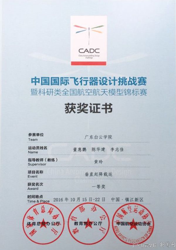 3月25-26日,由国家体育总局主办的CADC中国国际飞行器设计挑战赛暨全国航空航天模型公开赛(东莞站)在东莞理工学院举行,由我校大学生创新中心航模俱乐部9名同学组成的参赛队伍首次参加此项比赛,荣获电动滑翔机项目大学组二等奖和团体第八名。