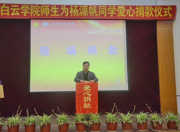 3月28日下午,“广东白云学院师生为杨源帆同学爱心捐款仪式”在儒学堂进行,仪式由校党委副书记李纯英主持。校长黄大乾作动员讲话。在校长黄大乾、副书记李纯英、副校长沈根生等校领导的带动下,各二级学院党总支、职能部门直属党支部、在校学生踊跃捐款,共筹集善款15万余元。