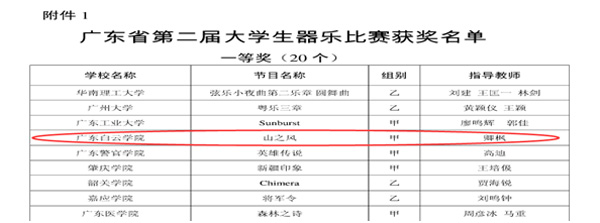 3月2日,我校校团委艺术教研室副主任卿枫指导的节目“山之风”荣获广东省第二届大学生器乐比赛一等奖。