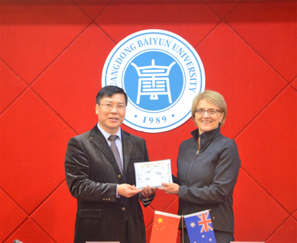 我校校长黄大乾(左)与西悉尼大学副校长琳达·泰勒(右)交换礼品