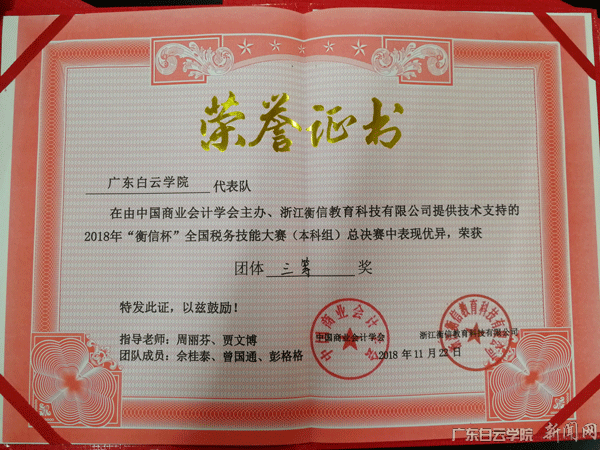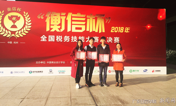 11月22日,由中国商业会计学会主办、浙江衡信教育科技有限公司提供技术支持的2018年“衡信杯”全国税务技能大赛总决赛在杭州顺利举办。会计学院周利芬和贾文博老师带领三位同学参加,并荣获团体三等奖。