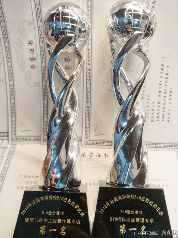 “启航团队”获得得“BIM招标项目管理”专项赛第一名奖杯与“白云梦之队”夺得“建筑与装饰工程量计算”专项赛第一名奖杯