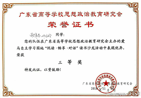 11月10日,由广东省高等学校思想政治教育研究会主办、华南理工大学马克思主义自主学习行动园地承办的“悦读·畅享·对话”读书沙龙活动在华南理工大学顺利举办,我校马克思主义学院选派了2016级英语7班邓文玲、2016级工程管理班谢卓昂和2016级财务管理1班黄凤霞、2017级工商管理1班杨陈顺等同学分别组成红星队和忠诚队参加了此次活动,均获三等奖。