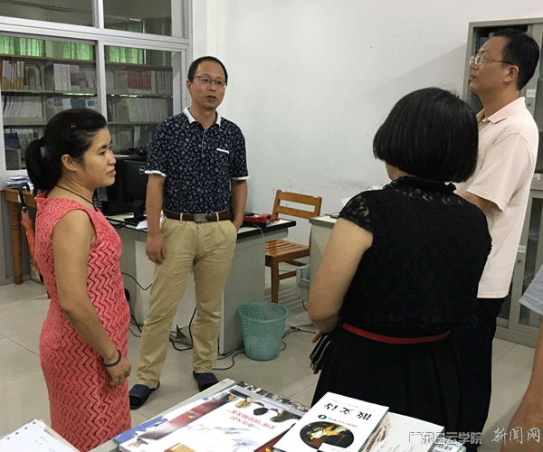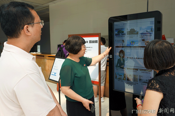 华南理工大学广州学院图书馆馆长杨华(中)为我校丁伟国馆长一行展示电子书借阅机