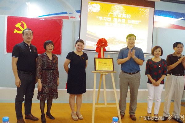 学校校长黄大乾(右三)、党委副书记李纯英(左二)、校长助理陈峰(左一)、和外国语学院党总支书记朱玲(左三)、副院长沈纯琼(右二)、副院长卜玉坤(右一)一起为广东省高校“学习型、服务型、创新型”党支部 揭牌