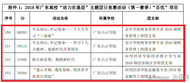 日前,2018年广东省高校“活力在基层”主题团日竞赛活动(第一赛季)优秀项目结果公示,我校四个主题团日活动入选省级“百优”项目,分别是会计学院财务管理专业2016级财务管理2班团支部主题团日活动《不忘初心,牢记使命—十九大学习“三部曲”》、会计学院财务管理专业2016级财务管理1班团支部主题团日活动《不忘初心,牢记使命—学习十九大精神,做新时代共青团员》、应用经济学院经济统计学专业2016级经济统计学班团支部主题团日活动《践行新思想,拥抱新时代》、应用经济学院金融系专业2016级金融学2班团支部主题团日活动《“逢山开路,遇水架桥,将改革开放进行到底”》。