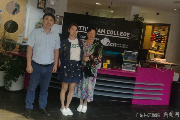 国际学院副院长兼国际交流处副处长刘毅(左一)与其他两位教师在诺丁汉学院接待室门口合影