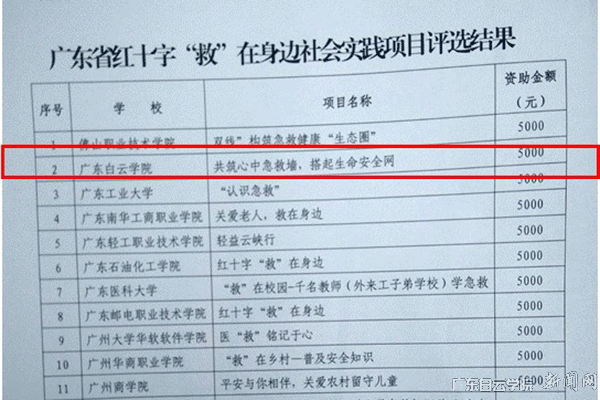 近日,从《关于下达2018年广东省“红十字‘救’在身边”社会实践项目经费的通知》文件获悉,我校红十字协会申报的“共筑心中急救墙,搭起生命安全网”红十字青少年社会实践项目获批成功并给予5000元资助。