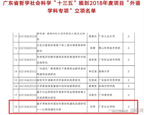 外国语学院英语系主任刘琴申报的《基于网络的中国当代事务性通知话语研究——以微信通知为例》项目获批立项