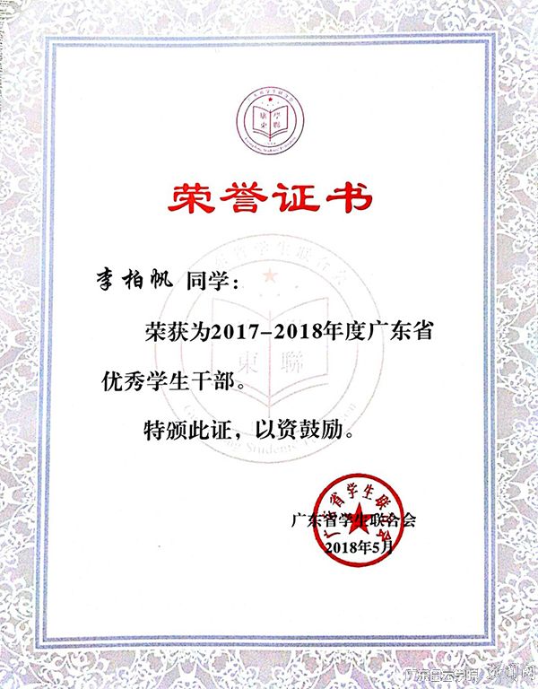 我校校学生会主席李柏帆被评为2017-2018年度“广东省优秀学生干部”