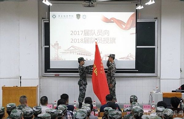 大会在庄严的国歌声中拉开帷幕。主持人介绍到会的领导嘉宾并宣布广东白云学院国防教育协会正式成立。在这紧张又振奋人心的时刻,大队长助理黄炽坤肩扛会旗,正步上台,授予国防教育协会会长罗健成协会会旗,完成授旗仪式。