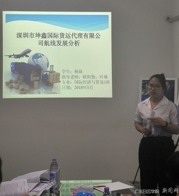 4月28日上午,应用经济学院学士学位论文校外公开答辩在深圳市坤鑫国际货运代理有限公司广州分公司举行。深圳市坤鑫国际货运代理有限公司总经理助理余惠珠及分公司总经理杨涛、广东白云学院副校长吴立平、应用经济学院院长吴铁雄、就业指导中心副主任黄天林出席了答辩会。答辩评委组由企业领导余惠珠、杨涛,我校应用经济学院贺政国教授、国际经济与贸易系副主任吴金蓉、专业老师毛政才担任。贺政国教授作为答辩组长主持本次答辩工作,我校应用经济学院国际经济与贸易系的谢静雯、王丽艳、黄捷勇、杨妹、黎怡岚五名同学参加了公开答辩会。