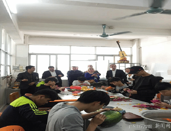 上午11点,代表团到达广州市白云工商技师学院。他们首先参观了以学生为主角,融学生实践教学、师生餐饮服务和西餐文化交流于一体实训中心-新开业的云涛轩西餐厅。随后在餐厅体验用餐,并对云涛轩西餐厅的西式设计、师生们的精湛职业技能和工学结合的教学模式表示高度赞赏,同时在提高学生餐厅服务方面提出了中肯的意见。
