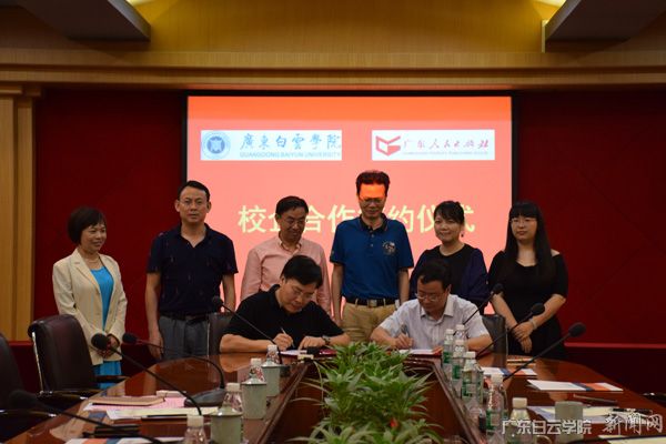 最后,黄大乾校长代表学校与肖风华社长签订校企合作协议书,并共同为广东人民出版社、广东白云学院千语街语言研究中心成立揭牌。(文/外国语学院诸丽英 图/大学生记者团摄影部学生黄名峰)