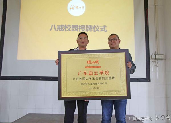 猪八戒网广州分公司总经理刘振亚(左)与我校艺术设计学院副院长方建松(右)进行八戒校园创新创业基地授牌