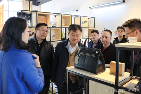黄大乾校长(左二)陪同刘志敏处长(左三)一行参观我校艺术设计学院学生创新作品展