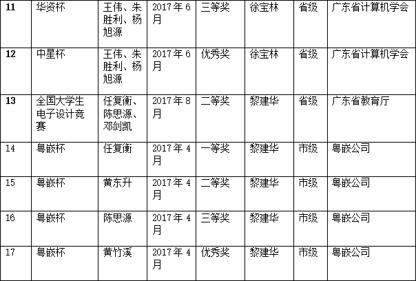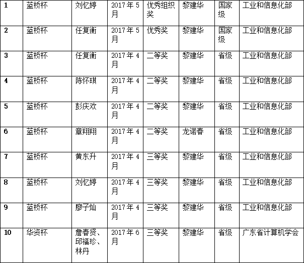 同样,学生团体在各类校内外竞赛中同样成果丰硕显著,先后获得2017年全国大学生电子设计竞赛省赛,获二等奖1项;在2017年第八届蓝桥杯全国软件和信息技术专业人才大赛中获省赛二等奖4项,三等奖3项,国赛优秀奖1项,国赛优秀组织奖1项,获蓝桥杯优秀指导老师奖8项;2017年“华资杯”广东省广东省计算机大学生作品赛暨泛珠三角大学生计算机作品赛广东赛区,获三等奖2项,以及多项校内竞赛奖项。(图文/电气与信息工程学院黎建华、郎毓洁)