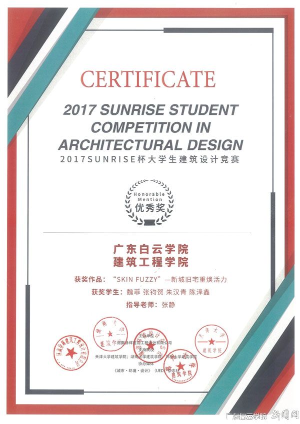 近日,中国 · 郑州,“SUNRISE杯大学生建筑设计方案竞赛”组委会传来消息。由9位国内知名建筑师组成的评审团,历经八个小时、三轮比选和多轮讨论,竞赛成绩终于揭晓!我校14级建筑学2班张钧贺、15级建筑学2班朱汉青、16级建筑学魏菲、陈泽鑫等同学获得优秀奖。