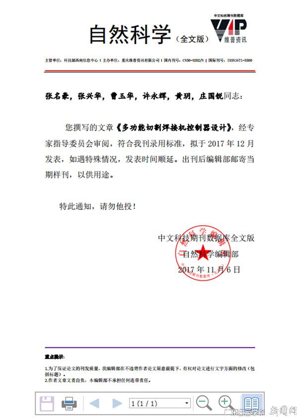 《多功能切割焊接机控制器设计》文章在中文科技期刊发表