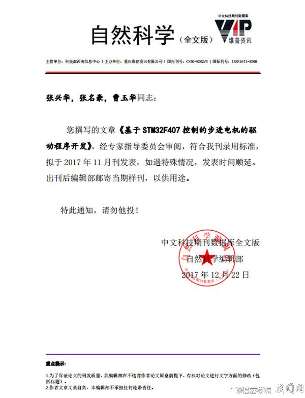 《基于STM32F407控制的步进电视的驱动程序开发》文章在中文科技期刊发表