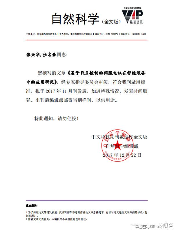 《基于PLC控制的伺服电视在智能装备中的应用研究》文章在中文科技期刊发表