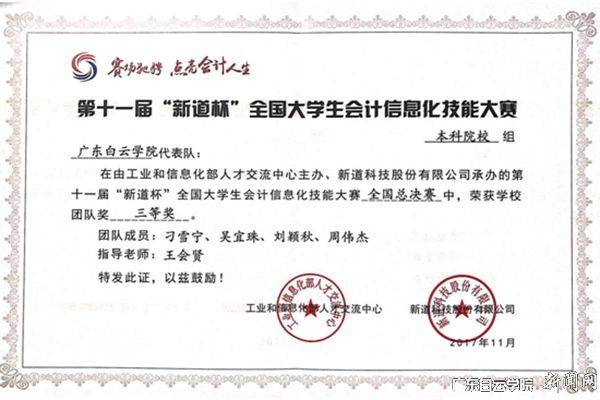 广东白云学院代表队荣获第十一届“新道杯”全国大学生会计信息化技能大赛三等奖