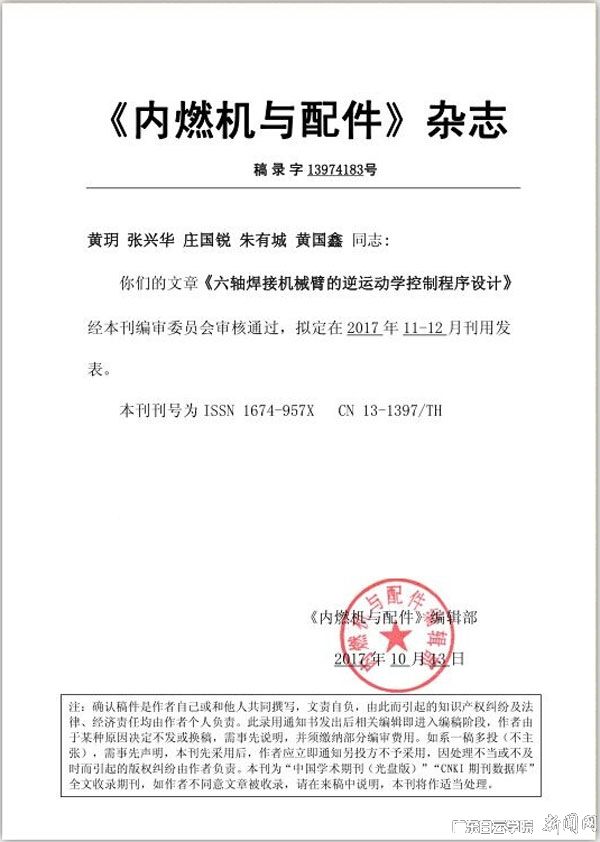《六轴焊接机械臂的逆运动学控制程序设计》文章在《内燃机与配件》杂志发表