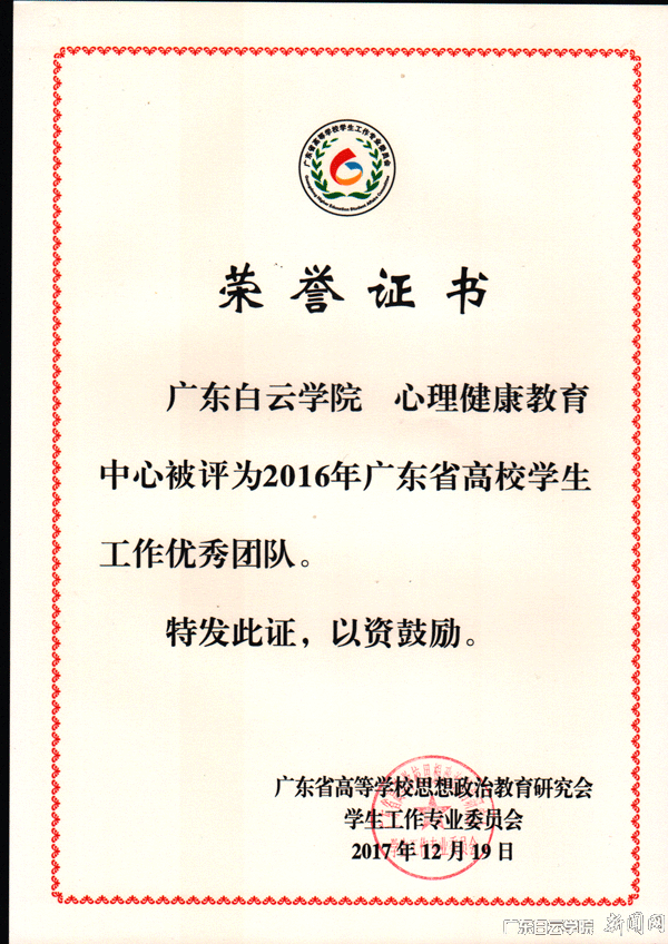 广东白云学院心理健康教育中心荣获“2016年广东省高校学生工作优秀团队”