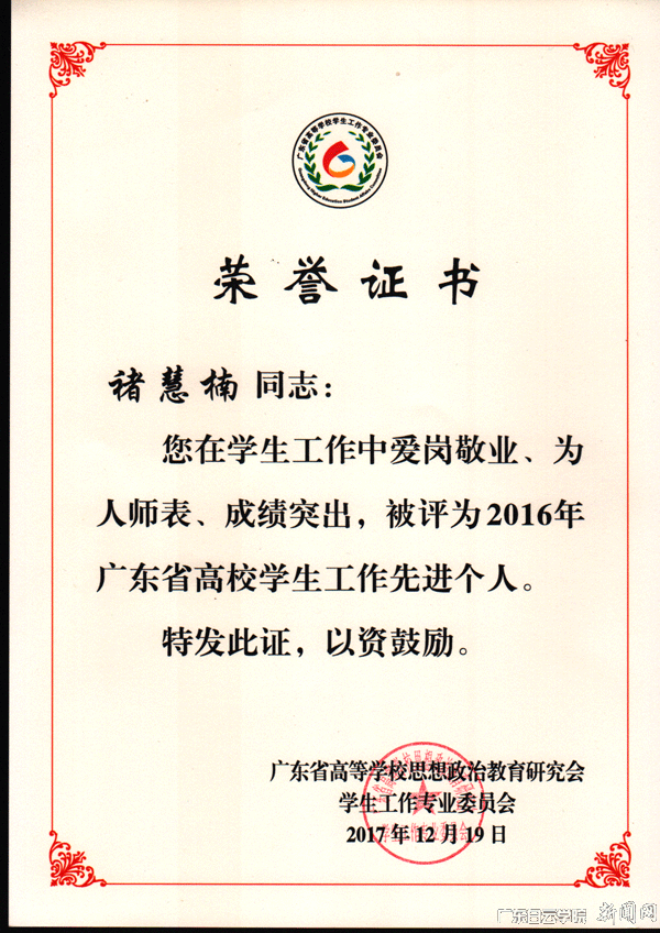 会计学院褚慧楠老师荣获“2016年广东省高校学生工作先进个人”