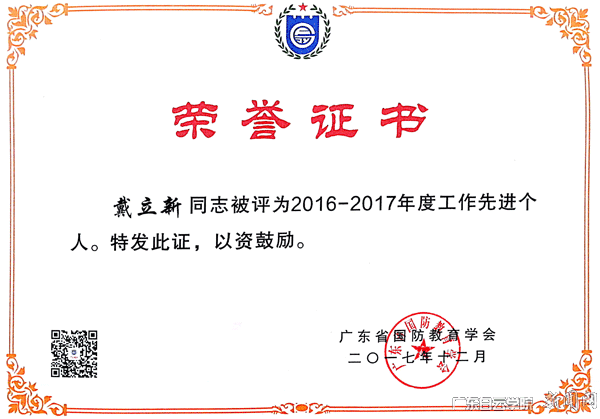 戴立新老师被授予广东省“2016-2017年度国防教育先进个人”荣誉称号