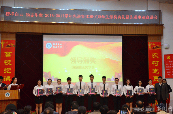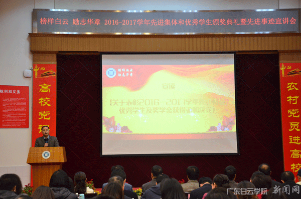 学生处副处长邓建侠宣读《广东白云学院关于公布2017年度国家奖学金、国家励志奖学金、国家助学金评定名单的通知》和《广东白云学院关于表彰2016-2017学年先进班级、优秀学生及奖学金获得者的决定》。