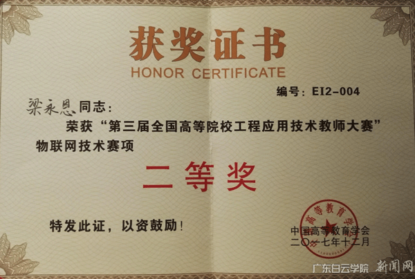 12月17日,历时3天的“第三届全国高等院校工程应用技术教师大赛”决赛在杭州落幕。本次大赛共有386名教师报名参加,经前期提交竞赛方案、专家初评,共有194名教师入围决赛,分别来自93所高校(其中“985工程”“211工程”院校17所,军事院校4所,一般本科院校72所)。大赛共评选出一等奖23名,二等奖50名,三等奖66名。我校大数据与计算机学院教师梁永恩最终荣获物联网技术赛项二等奖。