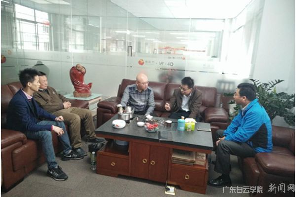 电气与信息工程学院副院长柳贵东(右二)一行与广州影动力文化有限公司总经理朱伟明(左三)深入洽谈校企合作项目