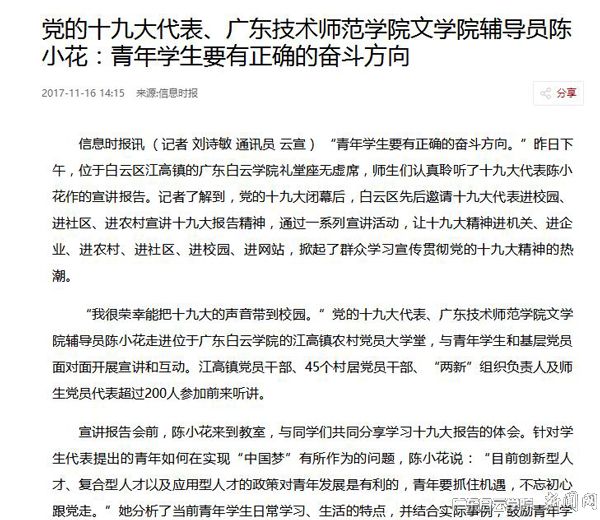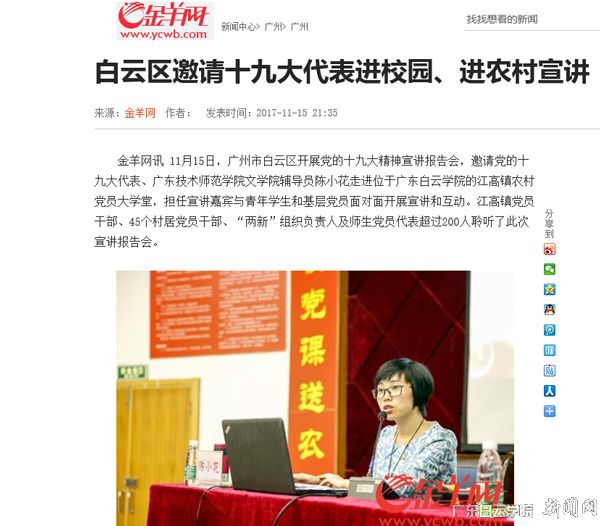 11月15日,党的十九大代表陈小花同志走进广东白云学院作学习党的十九大精神宣讲报告,她与我校师生深入交流学习心得。陈小花同志来我校引发了广泛关注,受到了广州电视台、信息时报、金羊网等多家媒体的报道。