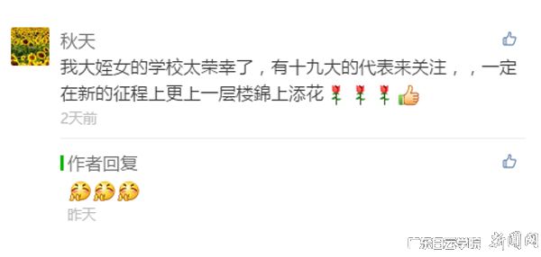 陈小花代表来到我校引发了广泛关注,不仅我校师生反响强烈,还受到了校友、学生家长和社会人士的点赞。有家长在“白云学工”的微信平台留言:我大侄女的学校太荣幸了,有十九大的代表来关注,(白云学院)一定在新的征程上更上一层楼錦上添花!