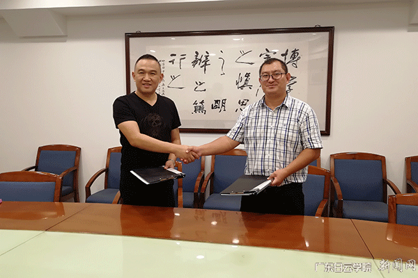 艺术设计学院副院长方建松(右一)与中山市尚仁服饰有限公司董事总经理雷红波(左一)现场签约