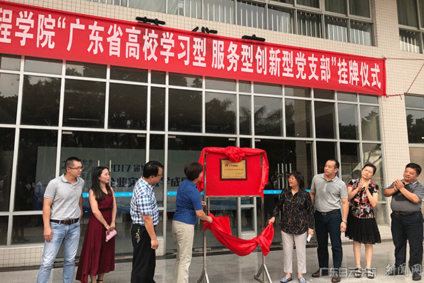 李纯英副书记、陈峰部长等领导与建筑工程学院党总支书记李淑敏、副院长袁富贵为广东省高校 “学习型服务型创新型”党支部的牌匾揭牌。(文/党委组织部李建华、学生党员干部林显锐 图/学工部马海停)