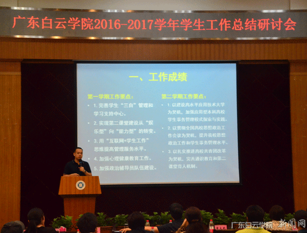 7月10日,广东白云学院学生工作总结研讨会在儒学堂隆重举行。学校校长黄大乾、党委书记刘剑锋、党委副书记李纯英、组织部、学生处、教务处、就业中心、保卫处、总务处、马克思主义学院等相关职能处室领导、二级学院总支书记、全体辅导员、生活老师共计100余人参加。会议由学生处副处长王晓艳主持。