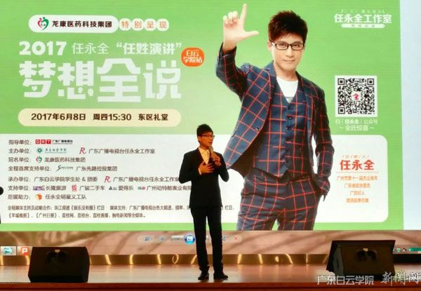 任永全,广东主持界领军人物、广东广播电视台珠江频道副总监、广东省政协委员,全国“德艺双馨”电视艺术工作者获得者、全国岗位学雷锋标兵、全国金话筒奖、广州十大杰出青年,著名粤文明化全球推广人、公益社会活动家。(图文/校团委熊彦辉、学生干部蔡莉)