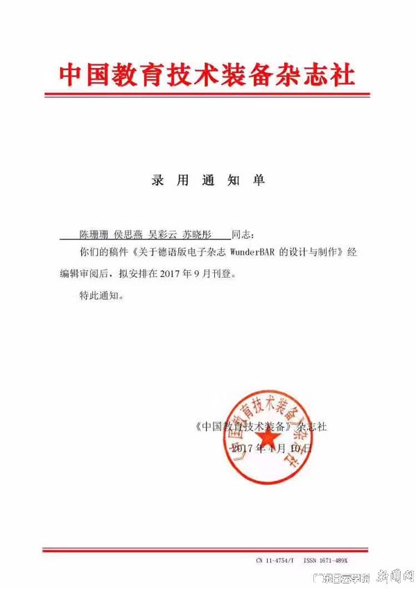 同时,由陈珊珊、侯思燕、吴彩云、苏晓彤四名团队成员共同撰写的项目论文《关于德语电子杂志WunderBAR的设计与制作》已被《中国教育技术装备》杂志社录用,将在2017年9月刊登。(图文/外国语学院陈婷)